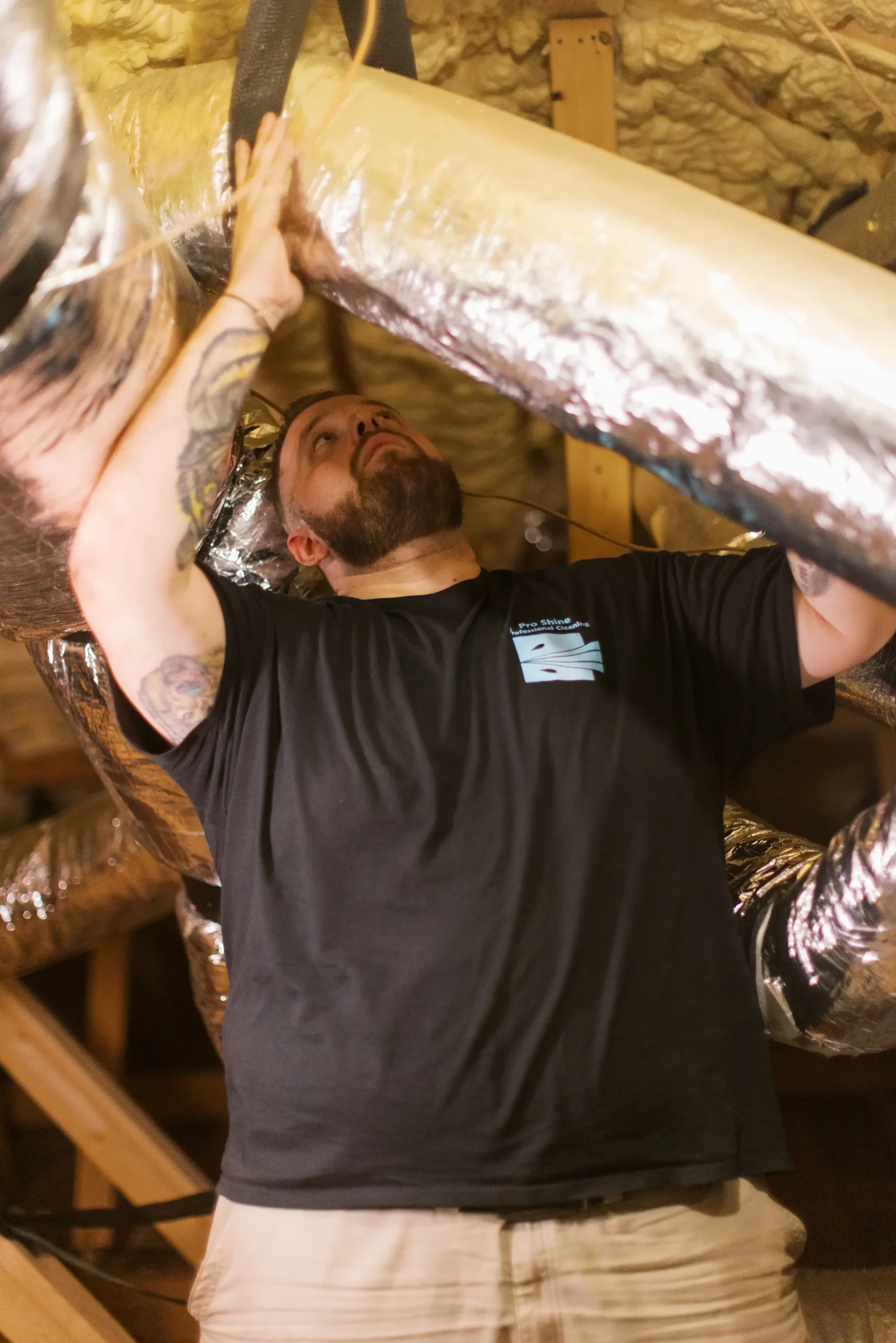 Air duct rewrapping is the process of replacing or repairing the insulation around your HVAC ductwork to restore proper temperature control and energy efficiency. Over time, the insulation around your ducts can become damaged, torn, or compressed due to age, moisture, pests, or poor installation. When this happens, your carefully conditioned air loses temperature as it travels through your ducts, forcing your HVAC system to work harder to maintain comfortable temperatures throughout your home. Pro Shine Cleaning’s professional air duct rewrapping services restore this critical barrier, ensuring your heated or cooled air reaches every room at the right temperature while protecting your ductwork from condensation and other environmental factors that can cause long-term damage.